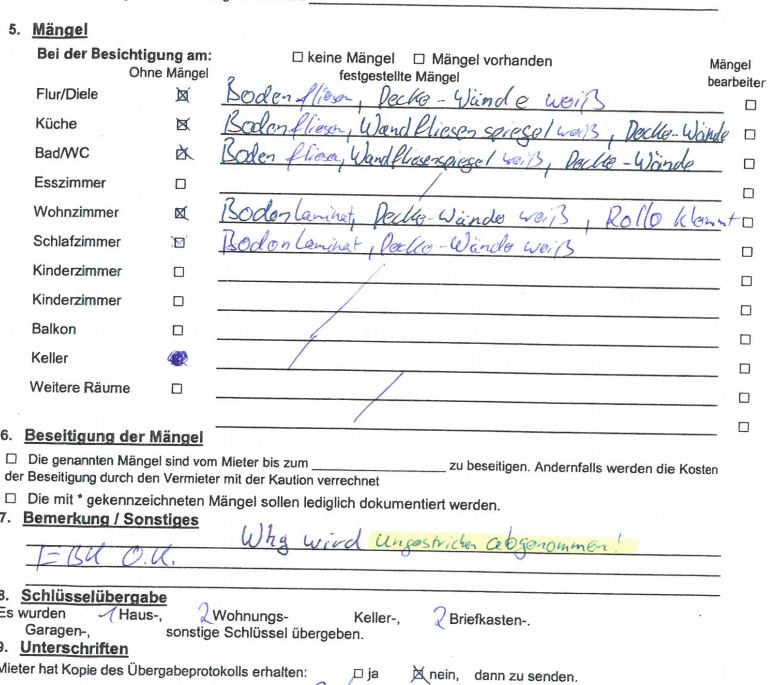 Die wohnungsübergabe und das dazugehörige wohnungsübergabeprotokoll beim einzug von mietwohnungen sollten mieter ernst nehmen. Vermieter übergeben die mietsache zum vertragsgemäßen gebrauch an die mieter. In der regel schließt sich dann der hinweis an, dass der mieter die wohnung beim auszug wieder in diesem zustand zu übergeben hat. Die rückgabe der wohnung und damit auch die übergabe der schlüssel erfolgt am ort der mietsache. Wohnungsübergabe protokoll „auszug vorname/name des mieters wohnungsanschrift wohnung wurde sauber, besenrein und ordnungsgemäß übergeben (passus andernfalls streichen und begründung angeben) zählerstand strom: